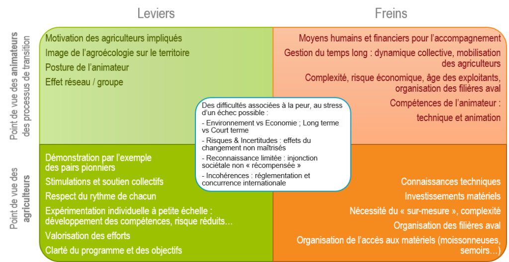 La matrice ci-après résume les freins et leviers pour la mise en œuvre des processus de transition agroécologique, du point de vue des animateurs de ces processus d’une part, et de celui des agriculteurs d’autre part.